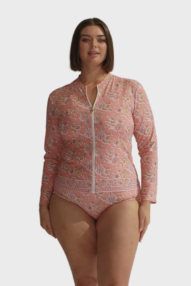 The Seychelles Long Sleeve Rash Vest will provide you with protection from the elements when you need it most. Featuring a full length zip closure and long sleeves, this rashie is perfect for long days spent at the beach. Keep this fabulous women's rash vest on hand when you need a little extra coverage. Pair it with a matching Seychelles swimsuit for a all over pink floral look that looks fabulous at the beach or pool.
