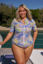Stay protected from the sun in style with our Paisley Pop Short Sleeve Rash Vest. The full length zip and short sleeves provide ease of wear, while the pastel paisley print adds a feminine flair. Wear it over your favourite Paisley Pop swimsuit and get ready to make a splash in this must-have beach essential.