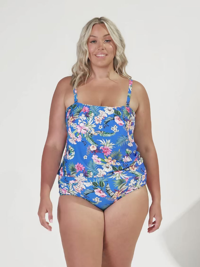 Make a splash with the Florida Flouncy Bandeau Tankini Top. This versatile tankini can be worn with or without straps to suit your style. The flouncy style provides tummy coverage giving you comfort and confidence at the beach or pool. Pair the strapless tankini top with the matching Florida High Waisted Pant to give the look of a one piece or mix it up with a navy bikini bottom. You'll look great and feel fabulous in this fun, floral tankini top.