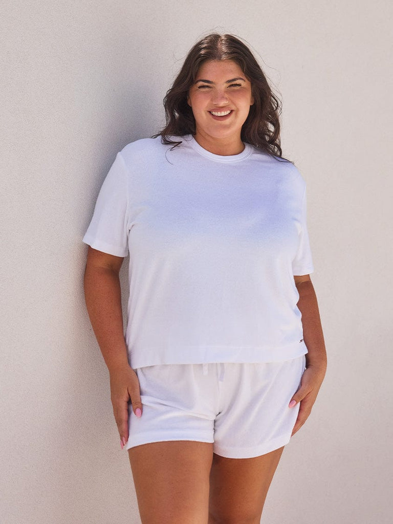 Our Terry Towelling collection is expanding! You've loved our shorts and dresses, now it's time for a Terry Towelling Top! This incredibly comfortable crew neck t-shirt is made from our super soft Terry, making it an easy go-to for everyday dressing. The White tee is a wardrobe essential and this Terry Towelling version offers a cool, elevated version that you can style in so many different ways. We love to pair ours with the matching White Terry Towelling Shorts for a cute and effortless co-ord set.